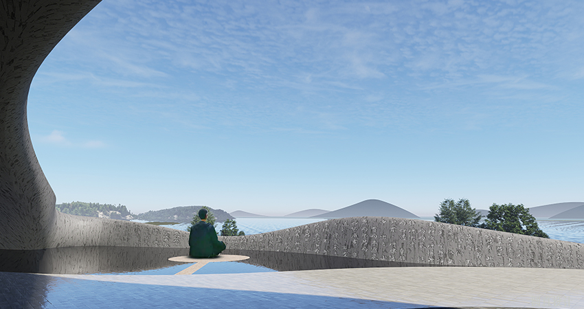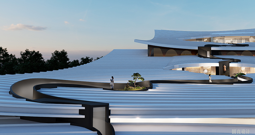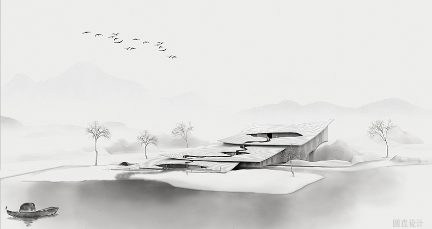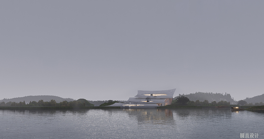 建筑以阳明心学作为整个建筑的文化核心,形体灵感源于王阳明心学三卷本那抹恣意流淌的“心”形墨迹,墨色自卷帙间溢出,缓缓汇入鉴湖的碧波,载着千年胆剑精神,流向当代文化的湖心。将阳明心学中抽象的胜利精神,创新精神,斗争精神凝练为具象的建筑语言。