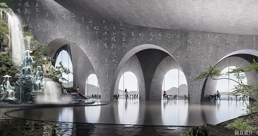 • 拱:设计立面以拱形元素为母体展开。白天,阳光透过拱形窗,在地面投下连绵的“船篷阴影”,随日光移动;雨天,雨滴顺着拱顶的弧线滑落,在玻璃上画出细长的水痕。室内望去,恰似乌篷船在雨雾中穿行时舱外模糊的湖景。拱形窗不仅是“看湖的眼睛”,更是“装裱风景的画框”,通过窗洞的位置与大小,让静态的建筑拥有了“船行湖中的动态叙事”,一窗一景,复刻“船行鉴湖”的动态美。
