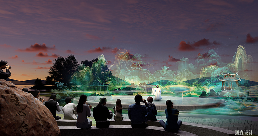 • 台:台即“寻心台”,以王阳明“心外无物”的哲思为魂,取圆形为象,暗合“圆满”“通透”之意。背后的白色建筑白天似宣纸般轻盈的浮于水面之上,夜晚则变身为巨幕,将越剧水袖的翩跹、鲁迅手稿的字迹,投影于其上,让传统与现代在月光下共舞。当游客乘乌篷船自鉴湖四面八方聚来,轻摇橹桨停靠台边,便成了“水上观众席”,重现《社戏》中“我们家的大船,篷是全盖起来的,里面有小台板,可以坐,可以躺”的鲜活场景。白日里,这里是市民晨练、孩童嬉戏的滨水广场,越剧票友自带胡琴在此咿呀弹唱。